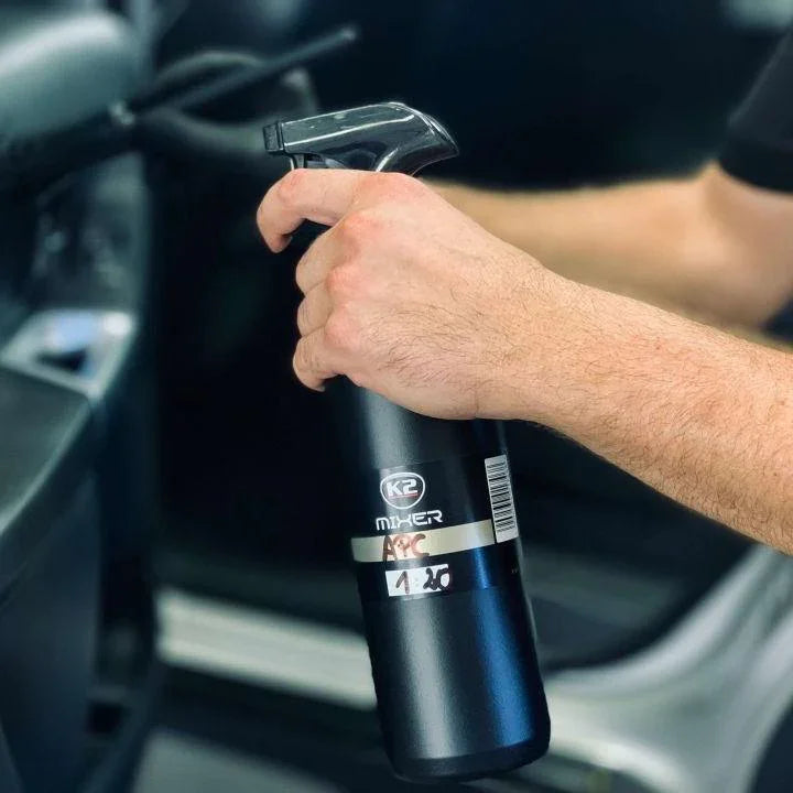 A sua forma ergonômica permite trabalhar confortavelmente e o copo de medida transparente permite o controle controlado da quantidade restante do produto e facilita a preparação da solução.
